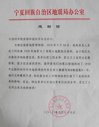 2010年9月28日,为建设海原地震博物馆,宁夏回族自治区地震局有关人员前来兰州收集1920年海原8.5级特大地震相关资料。因无法提供详细检索信息,我馆职工段永华、苏玉兰同志克服重重困难,帮助找到了1930年出版、时任中央地质调查所所长翁文灏撰写的《锥指集》一书。两位同志履职尽责、热忱服务的工作精神得到了宁夏回族自治区地震局工作人员的肯定和称赞,该局办公室专门致信我馆对我馆及两位工作人员表示感谢。