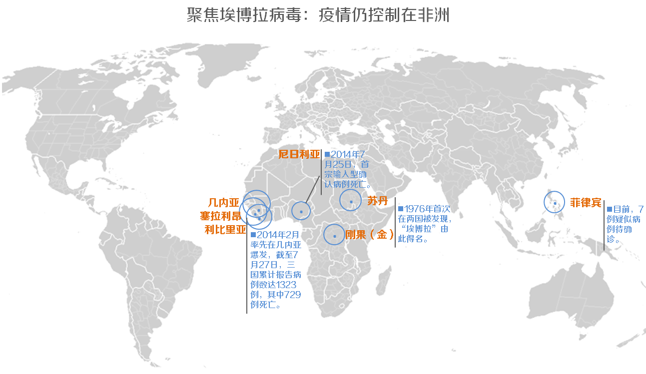 2014年2月,埃博拉出血热疫情在几内亚率先爆发。目前,该疫情加速蔓延,迅速扩散到利比里亚、塞拉利昂等西非国家。世界卫生组织新闻公报统计,截至7月27日,上述西非等国共计报告埃博拉病毒(Ebola Virus)感染病例1323例,其中729例死亡。据一直研究该病毒、密切监视该疫情的中国科学院武汉病毒研究所专家指出,本次爆发较之以往埃博拉出血热疫情有以下几个鲜明的特点:一是感染人数和死亡人数超过以往任何一次疫情;二是以往的疫情局限于某一部落村庄,今年的疫情呈现多国、多地点流行;三是今年的疫情极有可能走出非洲大陆,目前国际社会正加紧监控尼日利亚的57例疑似病例和菲律宾的7例疑似病例。由此,全世界拉响防控“埃博拉”的警报。