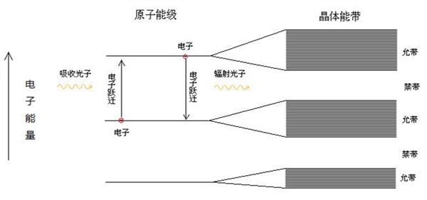 我们知道单个原子中的电子在原子核电场力的作用下围绕着原子核运动,由于微观粒子服从量子力学原理,这些电子只能处于固定的能量状态上,也就是处于固定的能级上。当电子从高能级跃迁到低能级时,会辐射一个光子,光子的能量等于电子减少的能量;相反,当电子吸收一个光子后,会从低能级跃迁到高能级。