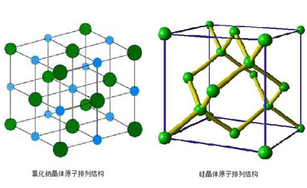 图2 氯化钠晶体和硅晶体的原子排列结构(图片来自网络)