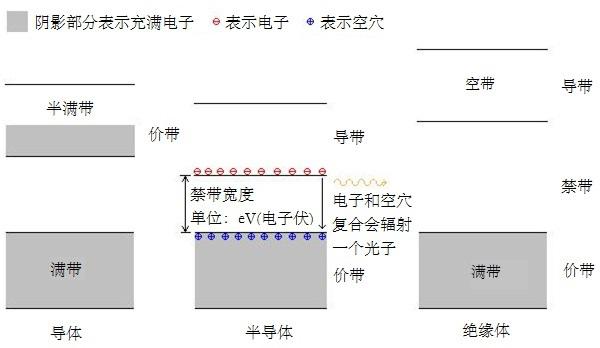 半导体晶体(比如硅)导带中原则上是不存在电子的,实际由于环境中的热激发(晶格原子振动和电子运动是热的两种存在形式),会将价带中少量电子激发到导带上,同时在价带形成带正电荷的空穴,所以半导体是由导带电子和价带空穴一起参与导电,电子和空穴统称载流子。空穴导电本质是价带电子导电,把价带电子导电等效成价带空穴导电易于理论分析。当电子从导带直接跃迁到价带与空穴复合,就会辐射一个光子,光子能量等于禁带宽度。如果把半导体放到绝对零度的环境中,失去热激发,半导体的导带和价带就分别失去了电子和空穴,从而失去导电能力。而绝缘体与半导体是类似的,绝缘体晶体(比如金刚石)的禁带宽度很宽,价带电子跃迁到导带需要很高的能量,在常温下几乎没有价带电子被激发到导带,所以绝缘体在常温下几乎不导电。这里的半导体和绝缘体是以导电性来划分的,实际上金刚石有半导体的一系列特性,也可以作为半导体材料。