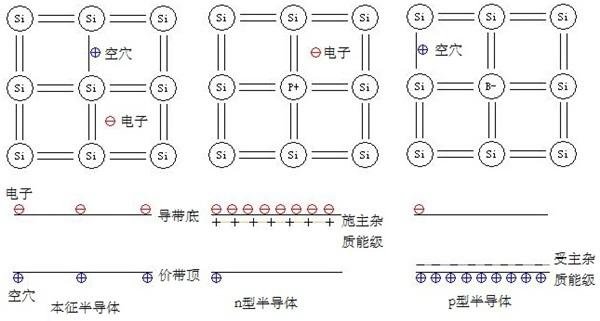 给硅中掺入杂质磷,就形成了n型半导体。磷的最外层有五个电子,与硅形成共价键后还多出一个电子,这个电子受到磷原子的束缚力很弱,就形成了导带电子,同时形成了一个磷正电中心,所以导带电子的浓度几乎等于杂质磷的浓度。同理,给硅中掺入杂质硼就形成了p型半导体。硼的最外层有三个电子,与硅形成共价键后还少一个电子,就形成了一个带正电的空穴和一个硼负电中心,这个空穴受到硼原子的束缚力也很弱,可以在价带自由运动。p型硅中空穴的浓度也几乎等于杂质硼的浓度。