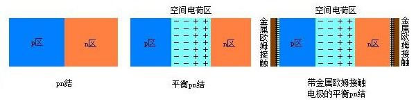 当把一块p型半导体和一块n型半导体结合起来,就形成了pn结,这是绝大多数半导体器件的一个最基本的结构。p型半导体和n型半导体结合后,p型半导体中的空穴会向n型半导体中扩散,在p型半导体中留下了负电中心;n型半导体的电子会向p型半导体中扩散,在n型半导体中留下正电中心,这样就形成了一个内建电场。载流子在内建电场作用下做漂移运动,形成与扩散电流相反的漂移电流,最终达到扩散漂移平衡,形成平衡pn结。此时,内建电场的电势差略小于导带底和价带顶间的电势差。内建电场的区域称为空间电荷区,空间电荷区因为失去了载流子,所以呈现高阻状态。