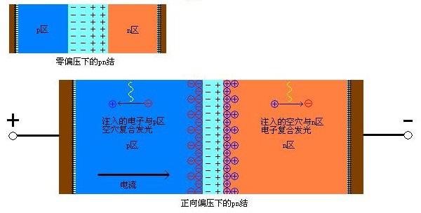 当二极管的两端加上正向偏压,大部分电压就加到空间电荷区上。这时内建电场电压降低,打破了载流子的扩散漂移平衡:p区空穴向n区扩散、n区电子向p区扩散,等效于外加电场给n区注入空穴、给p区注入电子。注入n区的空穴很快与电子复合辐射光子,注入p区的电子也很快与空穴复合辐射光子, pn结就在电场的作用下就不断的发光。在外加正向电压很小时,注入载流子的量极小,肉眼看不到发出的光;只有当外加电压接近或超过内建电场电压时才会大量地注入载流子,这样就可以看见二极管发出明亮的光。对于发光二极管,需要注入的电子和空穴尽快地复合,复合电流占总电流的比例越大发光效率越高,让电能更多地转化为光能而不是热能;而普通二极管一般需要注入的电子和空穴尽量少地复合。至此,就知道了发光二极管发光的秘密。