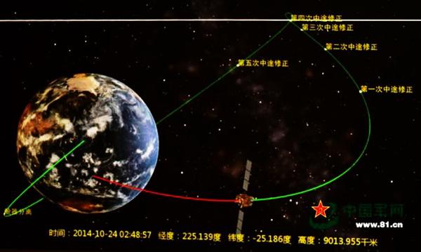 试验飞行器是北京时间10月24日2时由长征3号丙改二型火箭(CZ-3C/G2)在西昌卫星发射中心发射升空的。火箭飞行1,106.7秒后器箭分离,试验飞行器进入近地点高度为209km、远地点高度41.3万千米的地月转移轨道。