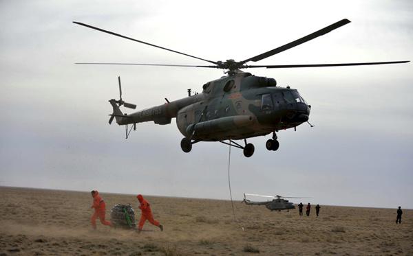10月30日,北京飞控中心对试验飞行器进行了一次中途轨道修正。11月1日试验飞行器进入整个航程中最关键和最惊险的时段:再入返回。北京时间当日5时53分,试验飞行器的服务舱和返回器分离,此时试验飞行器舱器位于南大西洋上空,距离地面约5,000km,速度为约10.8km/s。分离后,返回器进入自由飞行状态。6时10分接到建立返回再入姿态指令,此时返回器位于索马里以东印度洋上空,距离地面120km;2分钟后进入再入走廊,开始持续三分钟的初次再入并进入黑障区。6时15分第一次升力控制结束,返回器被反弹回大气层外,进入自由飞行状态,此时速度降低到第一宇宙速度。6时22返回器在中国青海上空转入第二次再入飞行状态,再次进入黑障区;4分钟后,返回器第二次飞出黑障区。6时32分在中国内蒙古上空距地面约10km时返回器执行弹伞舱盖指令;十几秒后,减速伞弹出,并带出庞大的主减速伞。6时41分返回器成功着陆在四子王旗预定着陆点附近,5分钟后就被搜索队找到。整个再入返回阶段,返回器飞行了约2万千米。