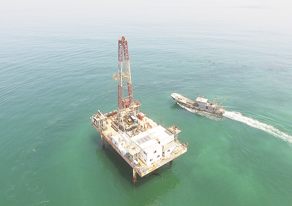 支撑海上施工的“探海一号”海上钻探平台,由山东省第三地质矿产勘查院自主研发生产,可在水深30米以浅陆架区作业,抗风14级,成本仅为类似石油钻井平台的1/10。