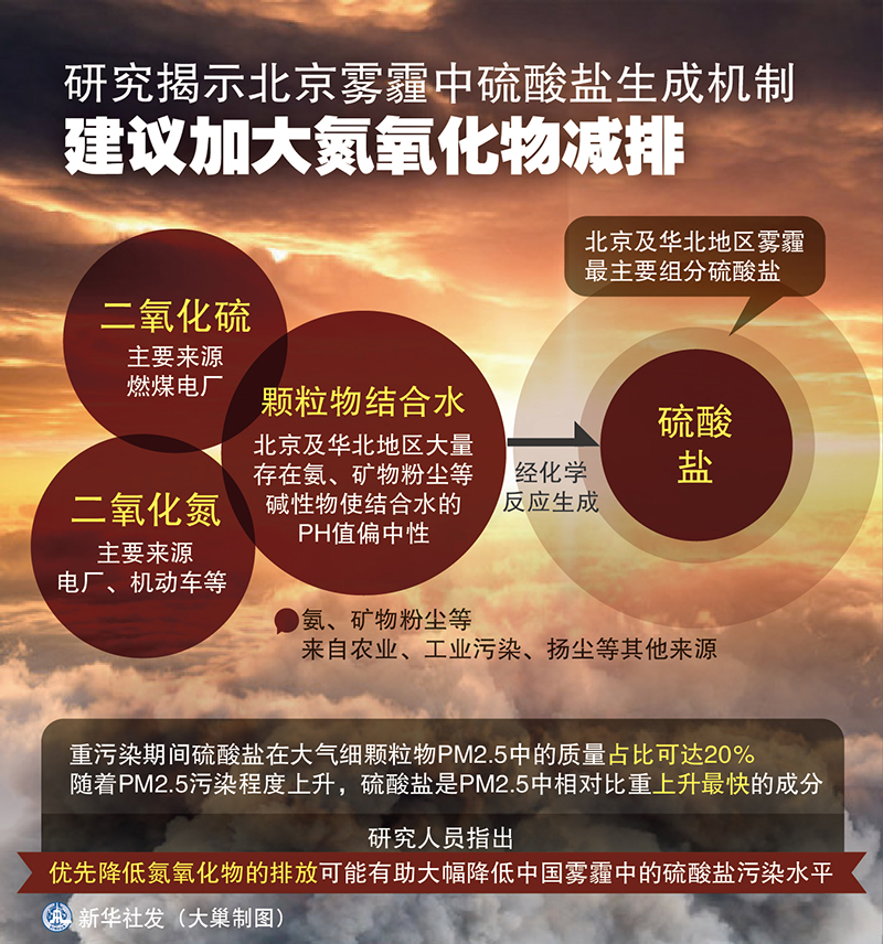 中德两国研究人员21日说,他们破解了北京及华北地区雾霾最主要组分硫酸盐的形成之谜,发现在大气细颗粒物吸附的水分中二氧化氮与二氧化硫的化学反应是当前雾霾期间硫酸盐的主要生成路径。这一发现凸显在继续实施减排措施的同时优先加大氮氧化物减排力度对缓解空气污染问题的重要性。