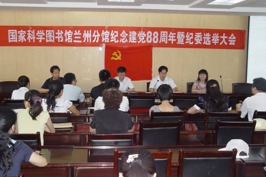 7月1日上午,在雄壮的国歌声中,国家科学图书馆兰州分馆纪念中国共产党建党88周年表彰暨兰州分馆纪律检查委员会选举大会正式开始。大会由兰州分馆党委书记王彦东主持,兰州分馆馆长张志强,副馆长高峰、吴新年,党委委员张学勤、肖仙桃和全体党员参加了会议。