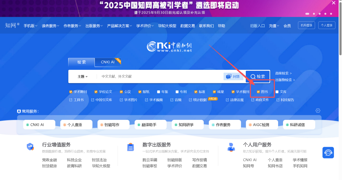 方法二:图书馆首页登录“中国知网首页”,点击搜索框右下方图书即可进入“图书检索页”。