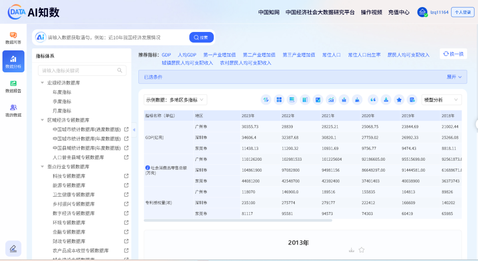 《AI知数》产品是基于中国知网自主调试开发的“统计数据大模型”,辅助实现“查数据”与“用数据”的智能化与自动化,其核心价值是“大模型赋能数据研究”。平台可以智能化的实现统计数据的数据问答、数据分析、数据解读、生成数据分析报告等,能够为目标用户提供有价值的数据支持和洞察分析。