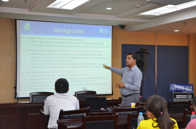 Maraseni博士主要从事气候变化适应与减缓、碳排放核算与建模等研究工作,先后发表学术论著80余篇/部,获得20余项国际学术奖励。此次学术报告主要围绕澳大利亚农业灌溉系统能源利用与碳排放问题进行了系统介绍,提出了农业管理转型的水资源-能源效率与碳排放综合目标的3种情景,并对澳大利亚等缺水地区的农业灌溉节水问题提出具体建议。