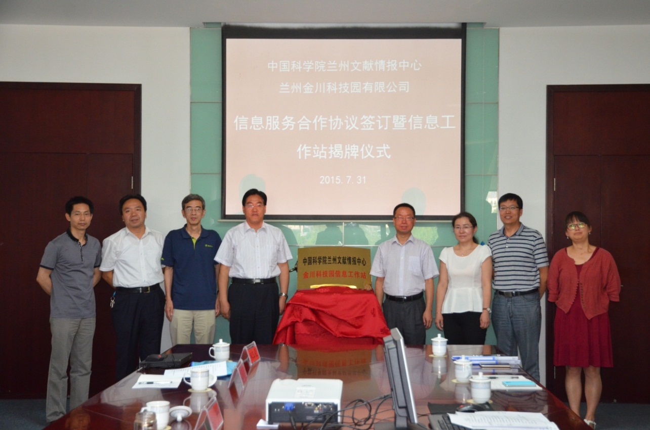 7月31日,中科院兰州文献情报中心与兰州金川科技园有限公司科技服务合作协议签字仪式和信息工作站揭牌仪式在兰州金川科技园有限公司举行,兰州文献情报中心主任张志强、兰州分院总工程师陈峰、兰州文献情报中心副主任高峰、吴新年以及区域发展咨询部、信息服务部负责人和工作人员,兰州金川科技园有限公司副总经理曹笃盟、科技部主任马骞、金川贵金属材料股份有限公司总经理张静及相关工作人员出席,张志强和曹笃盟分别代表双方单位在合作协议上签字并为信息工作站揭牌,协议签字和工作站揭牌仪式由马骞主持。