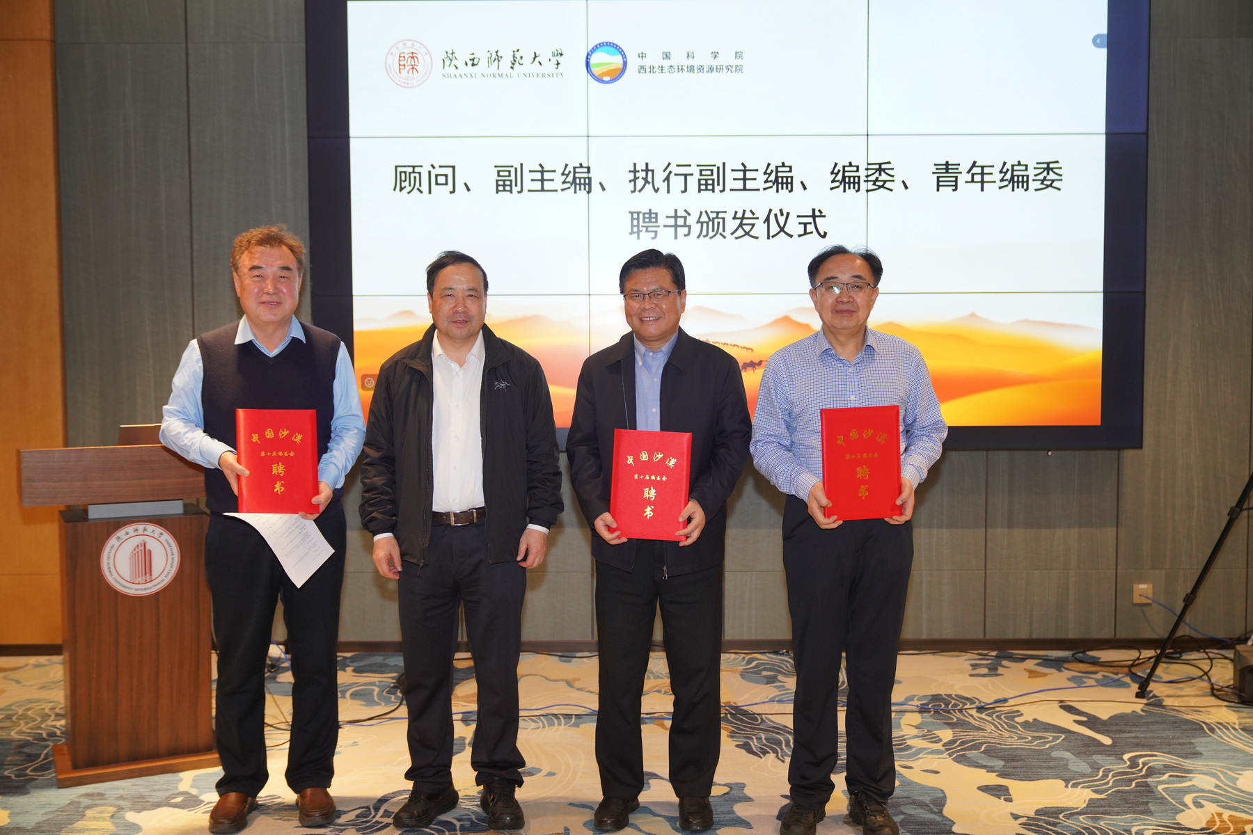 陕西师范大学党委书记李晓兵教授、西安石油大学党委书记常江研究员、中国科学院地球环境研究所所长孙有斌研究员、河南大学学术副校长刘彦随教授先后致辞,对《中国沙漠》第十届编委会的成立表示热烈的祝贺。冯起为到会的顾问、副主编、执行副主编颁发聘书。常江研究员、孙有斌研究员、刘彦随教授以及副主编李新荣研究员、赵文智研究员为到会的编委和青年编委代表颁发聘书。