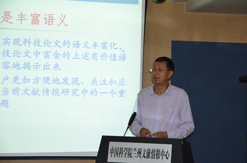 5月31日下午,中国科学院武汉文献情报中心主任张智雄研究员受邀在中心作题为《丰富语义组织揭示的研究与实践》的学术报告,兰州文献情报中心相关业务部门人员及研究生60余人参加了报告会。报告会由中心主任曲建升主持。